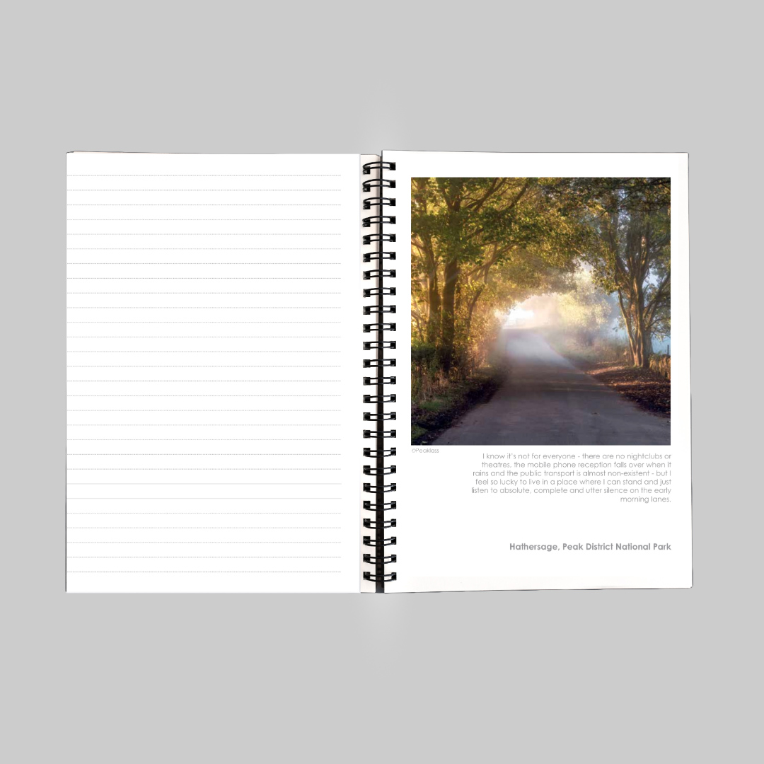 My Notebook is a must-have for any home or office, though I do say so myself! It contains 140 ruled pages interspersed with 24 of my own favourite photographs from across the Peak District, each with my comments about the image and its location. It’s A5 in size (21 x 15 cm), with smooth, uncoated paper to write on with ease, and it’s spiro-bound for lay-flatness. Use it as a journal, an adventure planner, for school or work notes, or just for handy reminders. It’s the perfect way to bring the beauty of the Peak District into your life every day!
